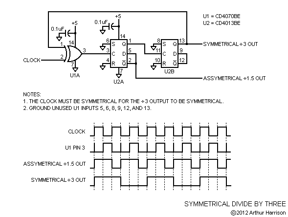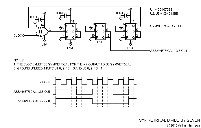 These digital divider circuits permit the division of a frequency by odd integers (three, five and seven illustrated) while maintaining an output with a nearly-perfect 50% duty cycle square wave. This symmetry is useful in music applications where square waves may be filtered efficiently to extract the fundamental sine wave, with, for example, switched capacitor or continuous low-pass filters. The first example's waveforms (divide by three) illustrates the basic technique of deriving appropriate positive-edge clocking transitions by utilizing an exclusive-or gate preceding the first flip-flop (U1A). The very-short transitions at the output of U1A correspond to the time of propagation through the two flip-flops and the gate. A supply of +5 volts is indicated, although the CMOS devices shown operate within a range of +3 to +15 volts. The maximum recommended clock rate is 3.5MHz for a +5 volt supply. For applications requiring higher speeds, the circuit is readily adaptable to a number of other devices such as those using the HCMOS or bipolar Schottky process.