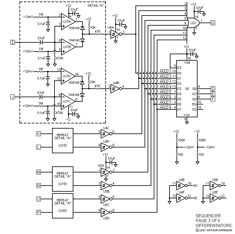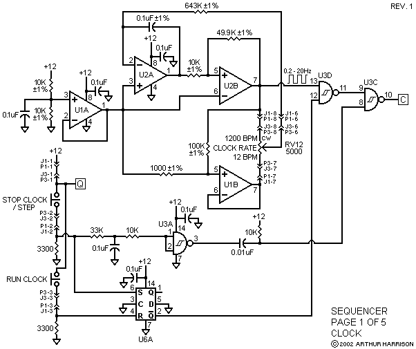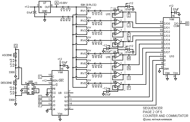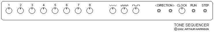 In this circuit, a set of eight ten-turn potentiometers are connected under the control of a counter, one at a time, by a commutating circuit, to the input of a voltage controlled oscillator (VCO). The result is a sequence of eight preselectable audible frequencies. The tone progression may be advanced either manually with the STEP push-button; or automatically at an even, adjustable tempo ranging from 12 beats per minute to 120 beats per minute, with the circuit's CLOCK knob. The sequence's order, ascending or descending, is selected with the DIRECTION pushbuttons.