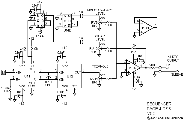 The circuit is conservatively designed to provide precise, repeatable performance; the precision potentiometers provide excellent pitch resolution, a band-gap voltage reference provides superb tone-frequency immunity from power supply fluctuations, and the precision monolithic VCO (U11) and differential amplifier (U12) provide clean, precise, temperature-stable waveforms. Used alone, this instrument is capable of producing many interesting tone patterns, and its capabilities may be magnified significantly with post-processing devices such as variable delays.