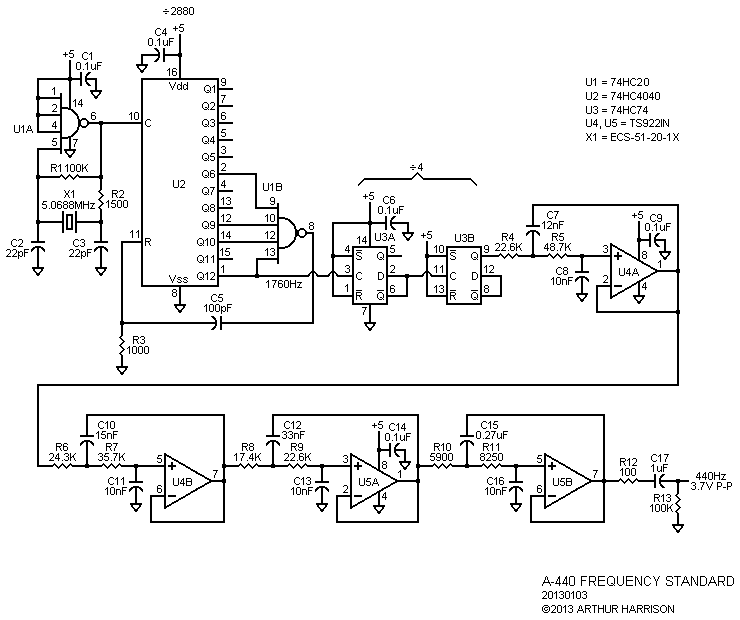 The crystal, X1, is part of a Pierce oscillator comprised of one-half of a dual 4-input NAND gate, serving as an inverter. Capacitors C2 and C3 are typical values that satisfy X1's 20pF parallel-loading specification. Note that some of X1's capacitive loading is also contributed by U1's input and output capacitance, as well as by "stray" lay-out capacitance. The specified crystal has an accuracy of +/-30PPM that will result in an output range between 439.9868Hz and 440.0132Hz. This may be trimmed closer to the optimal 440Hz by adjusting the value of C3. Note that R2's value is selected to be approximately equal to the capacitive reactance of C3 at 5.0688MHz.